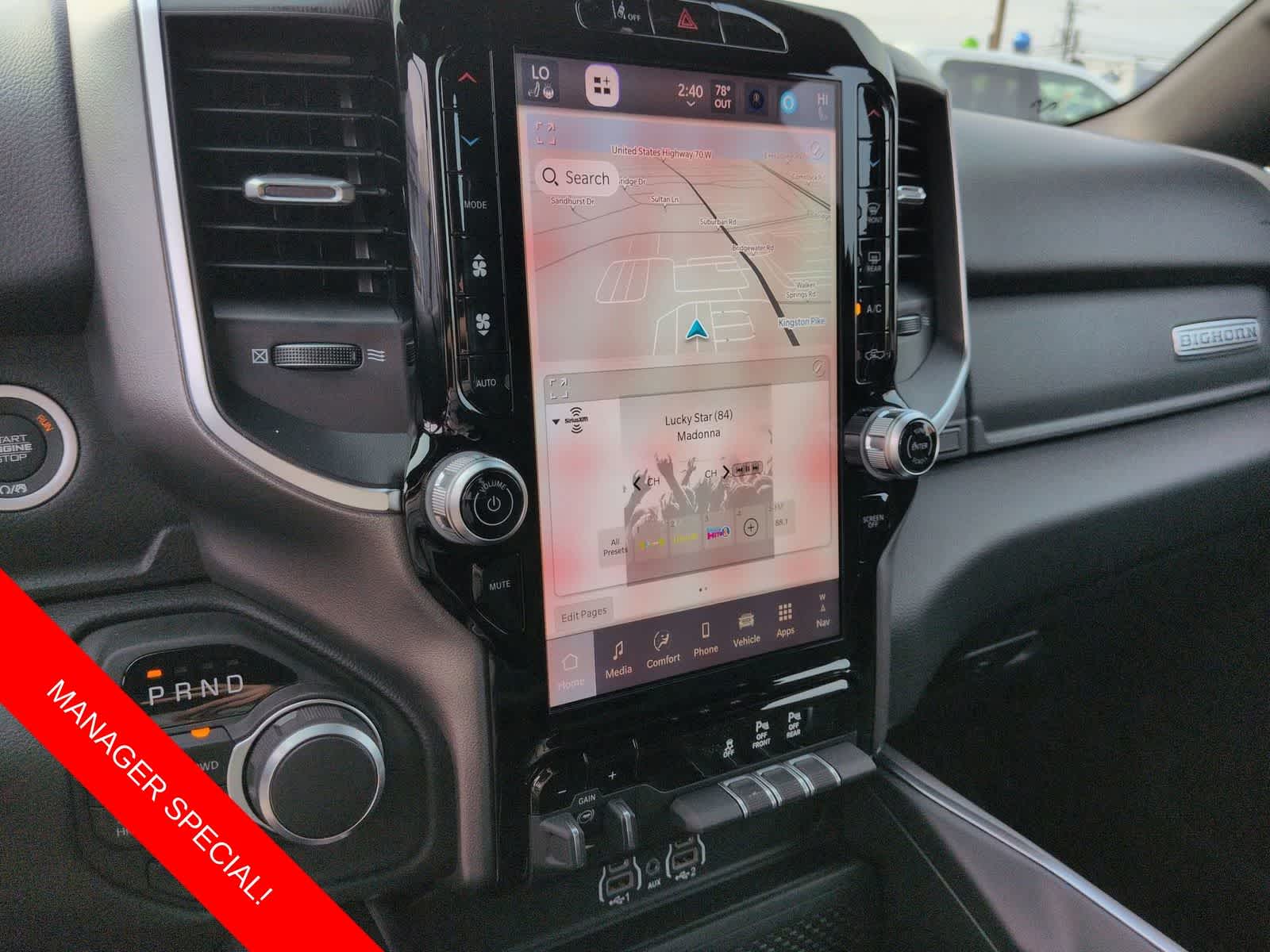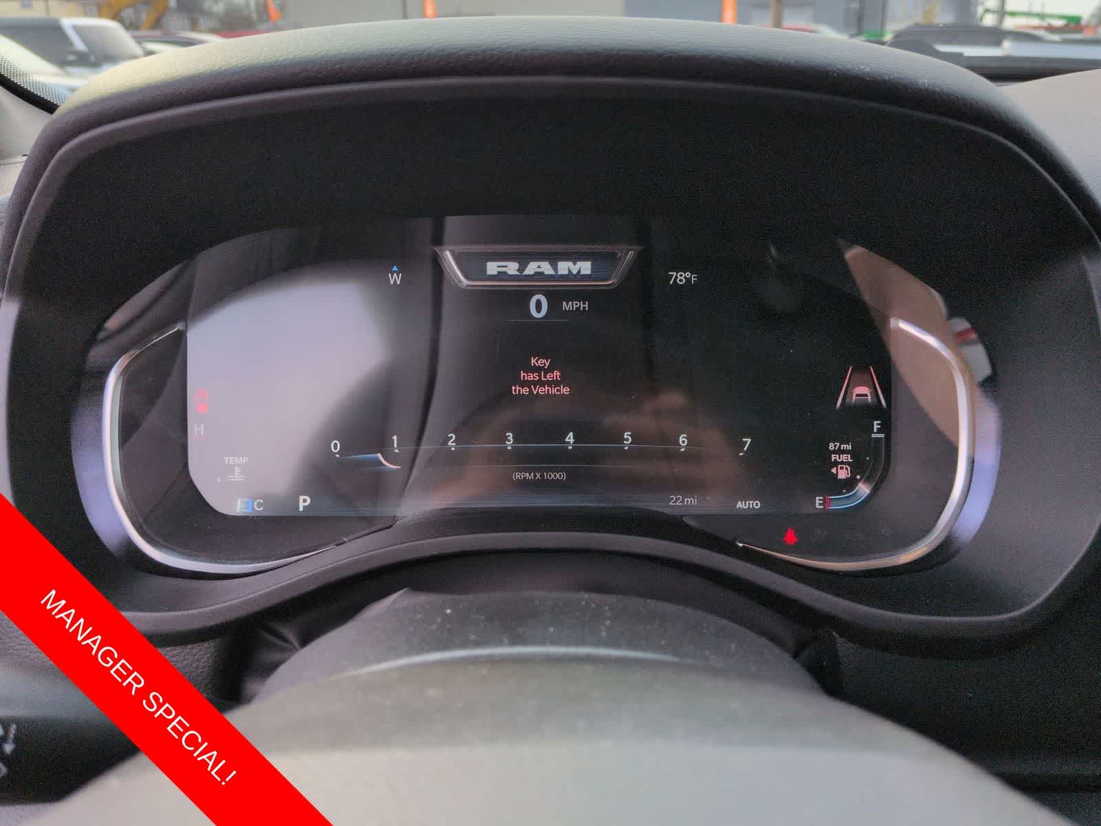 1500 Big Horn/Lone Star is nicely equipped with Bed Utility Group (Exterior 115V AC Outlet, MOPAR 4 Adjustable Cargo Tie-Down Hooks, MOPAR Spray in Bedliner, and Pick-Up Box Lighting), Big Horn Level 2 Equipment Group (115V Auxiliary Power Outlet, 115V Auxiliary Rear Power Outlet, 12 Touchscreen Display, 2nd Row in Floor Storage Bins, 3 Rear Seat Head Restraints, 4 Way Front Headrests, 400W Inverter, 4G LTE Wi-Fi Hot Spot, 9 Amplified Speakers with Subwoofer, Air Conditioning ATC with Dual Zone Control, Apple CarPlay, Auto Power-Folding Mirrors, Auto-Dimming Exterior Driver Mirror, Auto-Dimming Rear-View Mirror, Black Exterior Mirrors, Black Premium Power Mirrors, Body Color Fender Flares, Bucket Seats, Center Console Parts Module, Cluster 7.0 TFT Color Display, Configurable Drive Mode, Connected Travel and Traffic Services, Connectivity - US/Canada, Convex Wide-Angle Exterior Mirror Insert, Deluxe Cloth Bucket Seats, Disassociated Touchscreen Display, Exterior Mirrors Courtesy Lamps, Exterior Mirrors with Heating Element, Exterior Mirrors with Supplemental Signals, Front Seat Back Map Pockets, Full Length Floor Console, Global Telematics Box Module, Glove Box Lamp, Google Android Auto, GPS Antenna Input, GPS Navigation, HD Radio, Heated Front Seats, Heated Steering Wheel, Integrated Center Stack Radio, Integrated Voice Command with Bluetooth®, Leather Wrapped Steering Wheel, LED Dome Lamp with on/Off Switch, LED Footwell Lighting, Manual Adjust 4-Way Front Passenger Seat, Media Hub with 2 Charge Only USBs, Overhead LED Lamps, Power 2-Way Driver Lumbar Adjust, Power Adjust 8-Way Driver Seat, Power Adjustable Pedals, Premium Overhead Console, Radio: Uconnect 5 Navigation with 12.0 Display, Rear 60/40 Folding Seat, Rear Center Armrest, Rear Power Sliding Window, Rear Window Defroster, Remote Tailgate Release, Security Alarm, SiriusXM Radio Service, SiriusXM with 360L, Steering Wheel Mounted Audio Controls, Sun Visors with Illuminated Vanity Mirrors, Universal Garage Door Opener, and USB Host Flip), Night Edition (Accent Color Door Handles, Accent Color Premium Power Mirrors, Accent Color Tailgate Handle, Anti-Spin Differential Rear Axle, Black Exterior Truck Badging, Black Headlamp Bezels, Black Interior Accents, Black Painted Exterior Mirrors Caps, Black Tail Lamp Bezels, Body Color Front Bumper, Body Color Rear Bumper with Step Pads, Dual Exhaust with Black Tips, Grille Black Surround Black Mesh, RAM Grille Badge - Black, and Wheels: 20 x 9.0 Aluminum Painted Clad), Quick Order Package 27Z Big Horn, 4-Wheel Disc Brakes, 48V Belt Starter Generator, 6 Speakers, ABS brakes, Air Conditioning, Alloy wheels, AM/FM radio, Apple CarPlay/Android Auto, Auto High-beam Headlights, Brake assist, Bumpers: chrome, Cloth Bucket Seats, Cluster 12 TFT Color Display, Compass, Delay-off headlights, Driver door bin, Dual front impact airbags, Dual front side impact airbags, Electronic Stability Control, Front anti-roll bar, Front Bucket Seats, Front Center Armrest w/Storage, Front fog lights, Front reading lights, Front wheel independent suspension, Fully automatic headlights, Heated door mirrors, Illuminated entry, Low tire pressure warning, Manual Adjust 4-Way Driver Seat, Manual Folding Exterior Mirrors, Mopar Black Tubular Side Steps, MOPAR Front and Rear Rubb